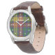 Stylish leather strap wrist watch, with the classic colourful Buchanan tartan plaid pattern, on the face, with white numbers and dots for the hours. White custom text reads Buchanan, and can be personalised to read what you want.