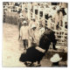 Cowboys in hats and rain coats watch a contestant coming out of the gate riding a bucking bull at a rodeo on a rainy day. Sepia print.