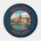 Budapest retro vector travel design in an emblem style. Budapest, Hungary’s capital, is bisected by the River Danube. Its 19th-century Chain Bridge connects the hilly Buda district with flat Pest.