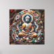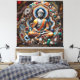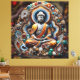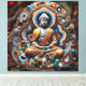 The image shows a Buddha statue intricately designed with a variety of colourful geodes and gemstones. The Buddha is depicted in a meditative pose, with hands resting on the lap and legs crossed. The statue is adorned with vibrant, multi-coloured stones, including agate slices, geodes, and other minerals, creating a visually stunning and elaborate backdrop.
