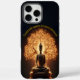 The serene figure of Buddha is depicted in meditation, emanating a warm golden light. Set against a dark background, the mystic atmosphere is enhanced by a tree that appears to flourish above, symbolising wisdom and enlightenment.