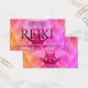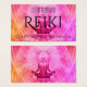 A modern design featuring Buddha meditating is done in pinks and purples on this Reiki business card.