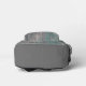 On this stylish backpack is a backdrop of chipped grey and blueish paint on rustic wood then decorative black floral wreath with a Buddha in the centre and on the front pocket is the word OM creating zen like vibes
