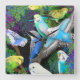 Original fine art painting of colourful budgies or budgerigar parrots by artist Carolyn McFann of Two Purring Cats Studio printed on a quality and customisable clock for pet bird lovers.