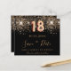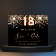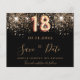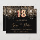 A girly and trendy Save the Date for a 18th birthday party. A black background decorated with faux gold glitter. Templates for a date and name and text. Golden coloured letters. The text: Save the Date is written with a large trendy hand lettered style script.