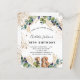 For a 18th birthday party. A white background decorated with eucalyptus greenery and golden leaves. Golden faux glitter spots. Personalise and add your names and wedding details. Black and golden coloured letters. Number 18 is written with balloon style font.