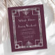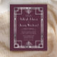 This elegant vintage-inspired wedding invitation features silver grey text on a burgundy red background, framed by a rectangular silver faux foil geometric vintage art deco design. The back of the card is solid burgundy.