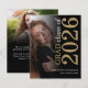 A value for money BUDGET alternative on a smaller size 4.5 x 5.6” semi-gloss 110lbs weight, which is of similar thickness to a postcard (however is not suitable to use as a postcard.). PLEASE NOTE there is ONE per sheet. Budget 2 photo Black Gold 2026 Graduation Announcement. A stylish typography and photo design to announce the news of your high school senior class graduate, with stylish large typography rotated and to the right hand side at the top in black and gold. Easily personalise the rest of the text. including your message on the back. Replace the photos in the templates on each side with your own.