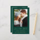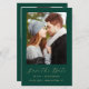 This simple, minimalist Save the Date card features a vertical arch above the words "Save the Date" in elegant gold-coloured handwriting script, followed by the couple's names, wedding date and city in sans serif font on an emerald green background. Add a second, horizontal photo to the back, along with a more detailed message with additional information.