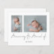 Minimalist 2 Photos Announcing the Arrival Script Birth Announcement. Simply replace the two sample photos with your own and personalise with your baby's name and birth date at the bottom and birth stats on the back. Announcing The Arrival Of is in a stylish set script.