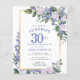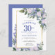Honour a special woman with this elegant and feminine Budget 30th Birthday Surprise Party invitation. Surprise and 30th are written in large blue text. Birthday Celebration follows. The honoured guest's name is also in blue capital letters. The birthday celebration details are surrounded by a chic gold frame. The blue flowers and white roses are nestled in deep green leaves.