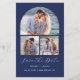 This simple, minimalist Save the Date card features an arch-shaped photo collage, with a horizontal photo two smaller square photos. Below, the words "Save the Date" appear in elegant white handwriting script, followed by the couple's names, wedding date and city in sans serif font on a navy blue background. Add a more detailed message with additional information on the back, along with a QR code to help your guests visit your wedding website.