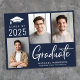 Modern dark navy blue budget-friendly graduation announcement featuring 3 photos and "Graduate" in a bold contemporary white script. Add the grad's name, class year and school or university in simple white typography.