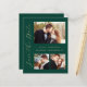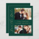 This simple, minimalist Save the Date card features a horizontal photo at the top and two square photos at the bottom. The words "Save the Date" run vertically up the left margin in elegant gold-coloured handwriting script. The couple's names, wedding date and city appear between the top and bottom photos in sans serif font on an emerald green background. Add a more detailed message with additional information on the back, along with a QR code to help your guests visit your wedding website.