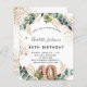 For a 40th birthday party. A white background decorated with eucalyptus greenery and golden leaves. Golden faux glitter spots. Personalise and add your names and wedding details. Black and golden coloured letters. Number 40 is written with balloon style font.