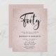 Budget 40th Birthday Modern Script Rose Gold Glitter Ombre Party Invitation... Our affordable modern script 40th Birthday party invitation features a background of blush rose gold glitter ombre overlaid with black script text spelling out "Forty" on top of the number 40 in dusty rose ink. Your party invitation text follows. All text (except for the "forty" and "40" text graphics) can be easily revised with your own details on the personalisation template.