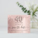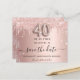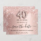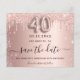 A girly and trendy Save the Date card for a 40th birthday party. Rose gold gradient background decorated with rose gold and faux silver glitter drips and dust. Personalise and add a date and name/text. The text: Save the Date is written with a large trendy hand lettered style script with swashes. Number 40 with a balloon style font.