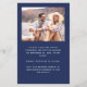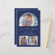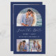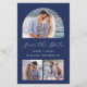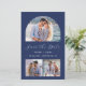 This simple, minimalist Save the Date card features an arch-shaped horizontal photo at the top and two square photos at the bottom. In between, the words "Save the Date" appear in elegant white handwriting script, followed by the couple's names, wedding date and city in sans serif font on a navy blue background. Add a fourth, horizontal photo and a more detailed message with additional information on the back.