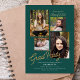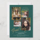 This graduation party invitation features a simple 4 photo collage on a dark jade green background accented with gold script text. Personalize with your favorite senior photos and your grad party invitation details.
