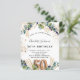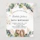 For a 50th birthday party. A white background decorated with eucalyptus greenery and golden leaves. Golden faux glitter spots. Personalise and add your names and wedding details. Black and golden coloured letters. Number 50 is written with balloon style font.