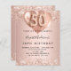 For an elegant 50th birthday. A rose gold faux metallic looking background. Decorated with rose gold, pink faux glitte, sparkles and balloons. Personalise and add a name, and party details. The name is written with a hand lettered style script, number 50 with balloon style fonts.