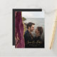 The left-hand edge of this elegant modern wedding save the date card features a burgundy red watercolor agate border trimmed with faux gold glitter. The customisable text overlay combines gold-coloured handwriting script and copperplate fonts over a photo of your choice. A black gradient filter helps make the text pop. The back provides spaces for four additional photos (one square, two horizontal and one vertical), along with room for your wedding website URL or other brief message in gold-coloured text on an off-black background.