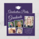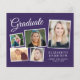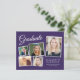 Modern budget-friendly purple graduation party invitation postcard featuring a 5 photo collage, "Graduate" in an elegant white script, and the grad's name, school and class year in simple white typography. Add your party details on the back. This budget semi-gloss paper is similar in weight to photo paper. A larger 5x7 traditional card stock version is also available (message us for the link).
