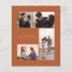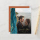 The left-hand edge of this elegant modern wedding save the date card features a teal blue watercolor agate border trimmed with faux gold glitter. The customisable text overlay combines gold-coloured handwriting script and copperplate fonts over a photo of your choice. A black gradient filter helps make the text pop. The back provides spaces for four additional photos (one square, two horizontal and one vertical), along with room for your wedding website URL or other brief message in gold-coloured text on a burnt orange or rust background.
