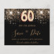 A girly and trendy Save the Date for a 60th birthday party. A black background decorated with faux gold glitter. Templates for a date and name and text. Golden coloured letters. The text: Save the Date is written with a large trendy hand lettered style script.