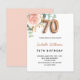 An elegant invitation for a 70th birthday party. A chic white background. Decorated with a rose gold and blush pink watercolored rose flower, floral, green eucalyptus leaves, sprigs, greenery and faux gold sprigs. Personalise and the name and party details. Black and golden letters. The name is written with a modern hand lettered style script. Number 70 is written with a golden balloon style font.