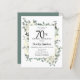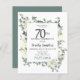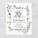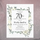Elegant 70th birthday party invitation features a botanical frame of white flowers and deep green leaves. The birthday person's name is written in a traditional script text. All of the text can be easily edited to create just the right celebratory tone.
