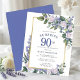 Honour a special woman with this elegant and feminine Budget 90th Birthday Surprise Party invitation. Surprise and 90th are written in large blue text. Birthday Celebration follows. The honoured guest's name is also in blue capital letters. The birthday celebration details are surrounded by a chic gold frame. The blue flowers and white roses are nestled in deep green leaves.