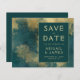 This elegant wedding Save the Date card features a modern teal blue and gold abstract watercolor background. Customise the gold-coloured text in stylish fonts on a dark teal rectangle, and add your wedding website URL to the solid teal back.