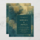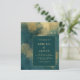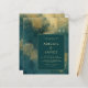 This elegant, moody wedding invitation features a modern abstract teal and gold watercolor background. Customise the gold-coloured text in stylish fonts on a dark teal rectangle. The abstract design is repeated on the back of the card.