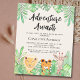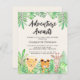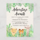 It features a hand-drawn watercolor of lion, giraffe, and tiger cubs with green palm leaves and says "Adventure Awaits!" in rustic typography.