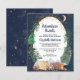 Budget-friendly rustic baby shower by mail invitation featuring a cute illustration of woodland animals with their tent camping in the mountains and forest, an overlay of gold stars and moon in a nighttime sky and "Adventure Awaits" and the mother-to-be's name in a dark midnight blue script. Easily personalise the shower by mail details.