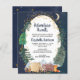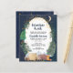 Budget-friendly rustic virtual baby shower invitation featuring a cute illustration of woodland animals with their tent camping in the mountains and forest, an overlay of gold stars and moon in a nighttime sky and "Adventure Awaits" and the mother-to-be's name in a dark midnight blue script. Easily personalise the virtual shower details, including an online link or text number or email address to obtain the online link.