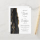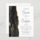 The left-hand edge of this elegant modern wedding invitation features a black watercolor agate border trimmed with faux gold glitter. The customisable text combines trendy charcoal grey script and sans serif fonts on a white background. The reverse side provides space for wedding details on a solid white background, along with a QR code guests can scan to visit your website and RSVP, which saves the cost of printing and mailing separate RSVP cards.