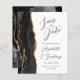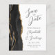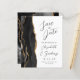 The left-hand edge of this elegant modern wedding save the date card features a black watercolor agate border trimmed with faux gold glitter. The customisable text combines charcoal grey handwriting, copperplate and italic fonts on a white background. The reverse side features a matching black and gold agate design.