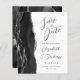 The left-hand edge of this elegant modern wedding save the date card features a black watercolor agate border trimmed with faux silver glitter. The customisable text combines charcoal grey handwriting, copperplate and italic fonts on a white background. The reverse side features a matching black and silver agate design.