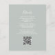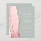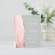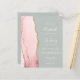 The left-hand edge of this elegant modern wedding invitation features a blush pink watercolor agate border trimmed with faux gold glitter. The customisable text combines white handwriting, copperplate and italic fonts on a pale sage green background. The reverse side provides space for wedding details on a solid sage green background, along with a QR code guests can scan to visit your website and RSVP, which saves the cost of printing and mailing separate RSVP