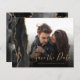 This elegant horizontal save the date card features a black watercolor agate border trimmed with faux gold glitter. Easily replace the sample image with your own photo of the future bride and groom. The customisable text combines gold-coloured handwriting script and copperplate font; a black gradient filter helps make the text pop. The back features a matching black and gold agate design.