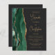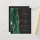 The left-hand edge of this elegant modern wedding invitation features an emerald green watercolor agate border trimmed with faux gold glitter. The customisable text combines trendy gold-coloured script and sans serif fonts on a dark background. The reverse side provides space for wedding details on a solid dark background, along with a QR code guests can scan to visit your website and RSVP, which saves the cost of printing and mailing separate RSVP cards.