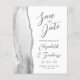 The left-hand edge of this elegant modern wedding save the date card features a grey watercolor agate border trimmed with faux silver glitter. The customisable text combines charcoal grey handwriting, copperplate and italic fonts on a white background. The reverse side features a matching grey and silver agate design.