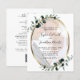 Budget All in One Eucalyptus Photo Gold Metallic Wedding Invitation... Our budget "All in One" botanical photo wedding invitation features a gold metallic oval frame embellished with sage and emerald green eucalyptus leaves bordering a photo of the bride and groom on a crisp white background. Your photo will be placed on a layer underneath a white transparency to "fade" the colours somewhat so the text on top is readable. The back of the invitation contains all of the details you would typically see on separate cards in the wedding packet. This modern style wedding invitation was designed to be both elegant and budget conscious... not to mention time-saving. On the back there is also a QR code graphic template you can replace with your own code (or delete if you don't plan to use one... also - don't forget to delete the text that refers to the QR code information). All example text can be easily revised with your own information on the personalisation template. PLEASE NOTE: Budget cards do not automatically come with envelopes, as do the traditional invitations, but you can purchase them on the same page at checkout if you wish. This all in one design is also available on a traditional 5x7 wedding invitation.