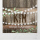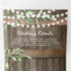 A 3 in 1 rustic country chic wedding trifold invitation featuring a rustic wood barrel background, twinkle string lights, botanical greenery watercolor foliage, your monogram, wedding details, wedding invite, and an rsvp postcard for your guests to cut off and send back.