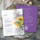 Budget All in One Watercolor Sunflower and Lavender Monogram Wedding Invitation Flyer... Sunflower symbolism: happiness, joy, enduring love. Lavender flower symbolism: love and devotion, calmness. Our "All in One" budget flyer paper floral wedding invitation features a beautiful bouquet of watercolor sunflowers and lavender setting off the bride and groom's monogram initials and the invitation text beside it. The dark lavender back of the invitation contains all of the details you would typically see on separate cards within the wedding packet. This modern style double-sided wedding invitation was designed to be both elegant and budget conscious... not to mention time-saving. On the back there is also a QR code graphic you can replace with your own code by typing your wedding website URL on the personalisation template. All example text can be easily revised with your own information on the same template. **PLEASE NOTE: "Flyer" budget paper is not the same as the traditional flat card invitations or even our 110 lb budget invitations. The flyer option is the least expensive of our invites, with 80 lb paper (similar to leaflet paper) compared to traditional wedding invitation flat cards at 5 x 7 inches in matte paper at 120 lb weight. Also, the budget invitations do not automatically come with envelopes, as do the traditional invitation cards, but you can purchase them on the same page at checkout if you wish.