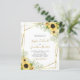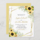 Budget All in One Sunflowers Foliage Gold Geometric Frame Wedding Invitation... Our affordable "All in One" floral and greenery wedding invitation features a gold geometric frame embellished with bouquets of bright yellow sunflowers and delicate green foliage bordering your gold ink wedding invitation text. The back of the invitation contains all of the details you would typically see on separate cards in the wedding packet. This modern style wedding invitation was designed to be both elegant and budget conscious... not to mention time-saving. On the back there is also a QR code graphic template you can replace with your own code (or delete if you don't plan to use one). All example text can be easily revised with your own information on the personalisation template.