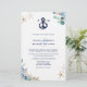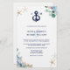 Budget wedding invitation. Joyful and creative beach wedding design combining nautical elements (navy anchor, knot, starfish) with beautiful floral bouquets of blue hydrangea, blush pink and white anemone flowers, eucalyptus leaves, dahlia, and greenery. Bride’s and Groom’s monograms. Navy lettering. Truly unique. Ideal for beach wedding, nautical wedding, destination wedding, summer wedding.