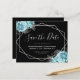 This elegant budget wedding save-the-date card features a silver geometric frame decorated with aqua and silver flowers on a black background. The customizable text combines silver gray whimsical handwriting, copperplate and italic fonts.